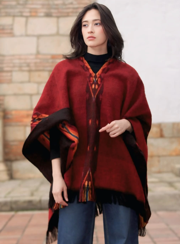 Ruanas, bolsos y accesorios tejidos por artesanos Kichwa en Colombia.